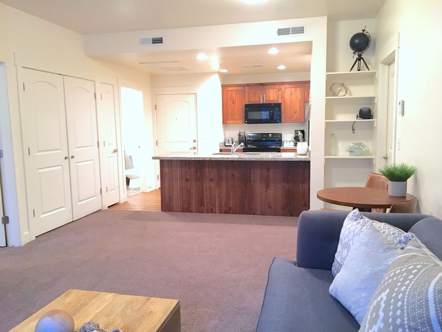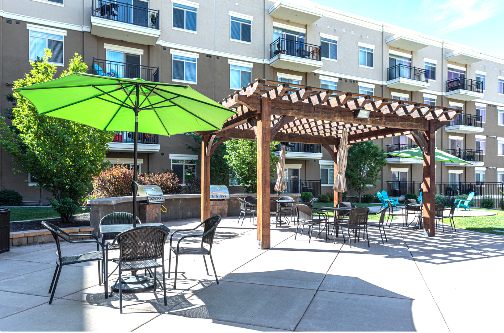Our beautiful courtyard features a large pool, in-ground spa (open year-round), fire pit, and built-in BBQ grills for the best entertainment.