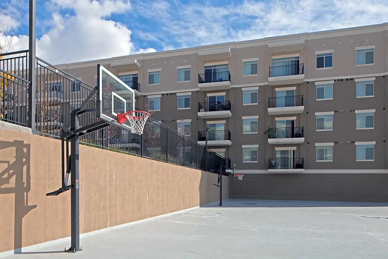 We have a very well-equipped, 1300 SQ FT 24-hr fitness center, a large fenced dog park where your pup can play with their community pup friends, 2 basketball standards in our enclosed sports court, 3 ELEVATORS, and indoor controlled-access parking garages.